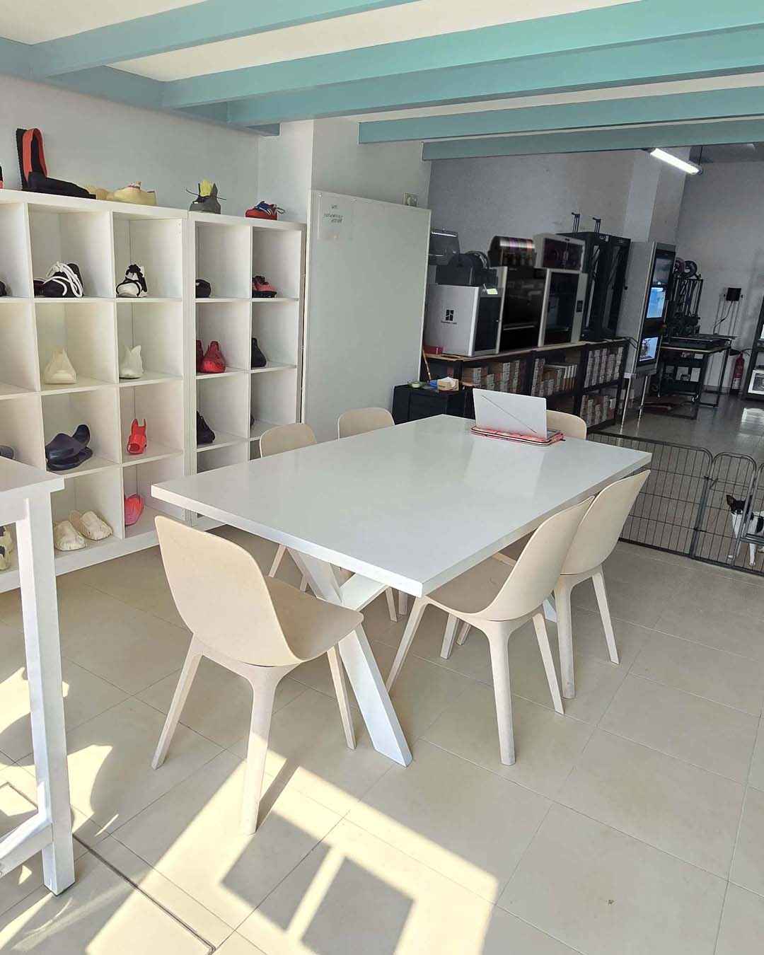 In the front of the lab we have a space for small classes or meetings and here we show the history of 3D printed footwear, with examples of almost all essential past and current 3D printed shoe brands, not just in FDM, but also in powder and resin.