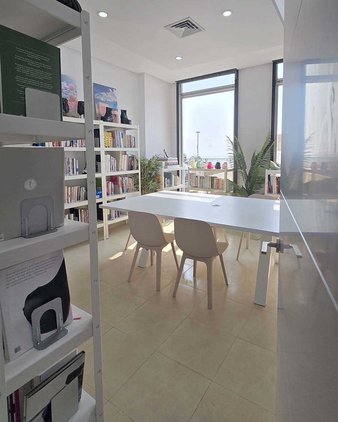 Our large library - with spectacular sea views - has a unique collection of books on footwear and sneaker history, design and technology, as well as a fantastic selection of books on materials, industrial design, art and architecture. It has a big work table for larger meetings or classes, as well as a big TV screen for presentations.